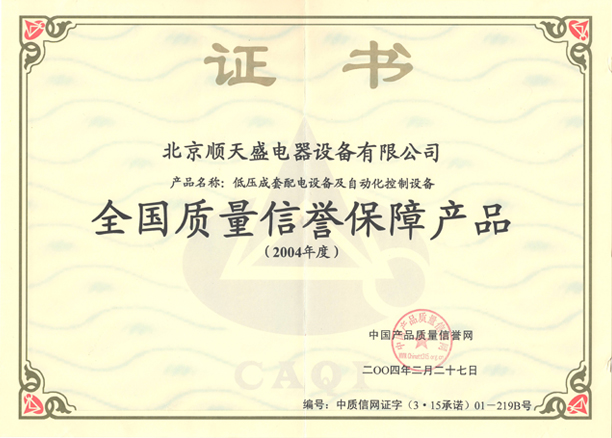 全國(guó)質(zhì)量信譽(yù)保障產(chǎn)品證書(2004)